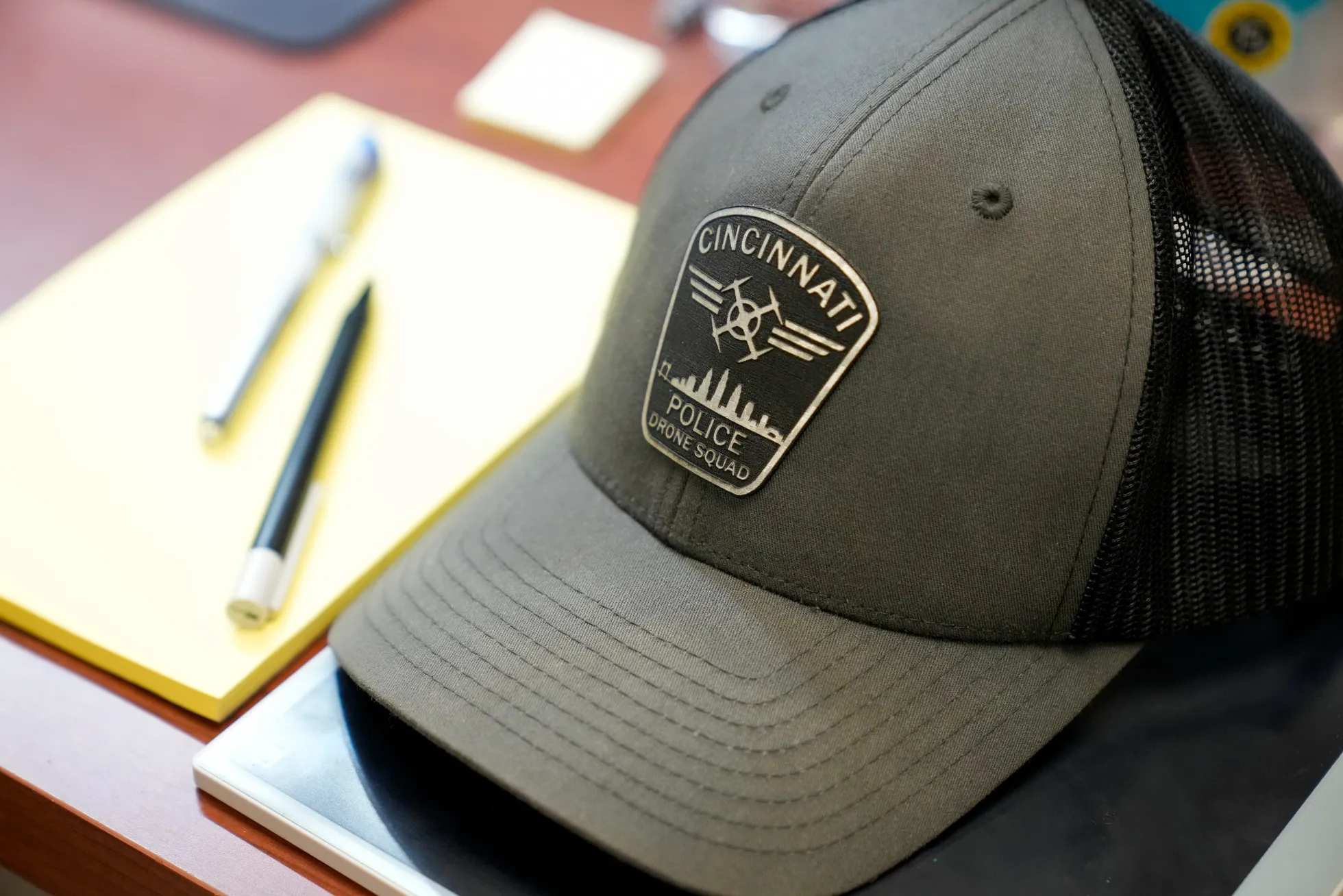 The Cincinnati Police Drone Squad patch on a hat at the District 1 headquarters on Nov. 13. Sam Greene/The Enquirer