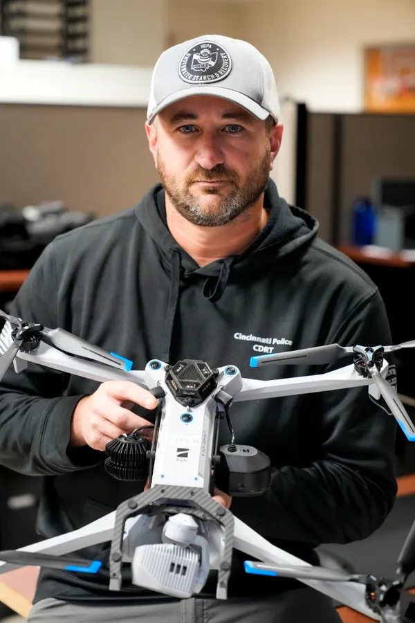 Sgt. Jay Kemme holds a Skydio X10 drone used by the department’s Drone Squad at the Cincinnati Police Department District 1 headquarters on Nov. 13. Sam Greene/The Enquirer