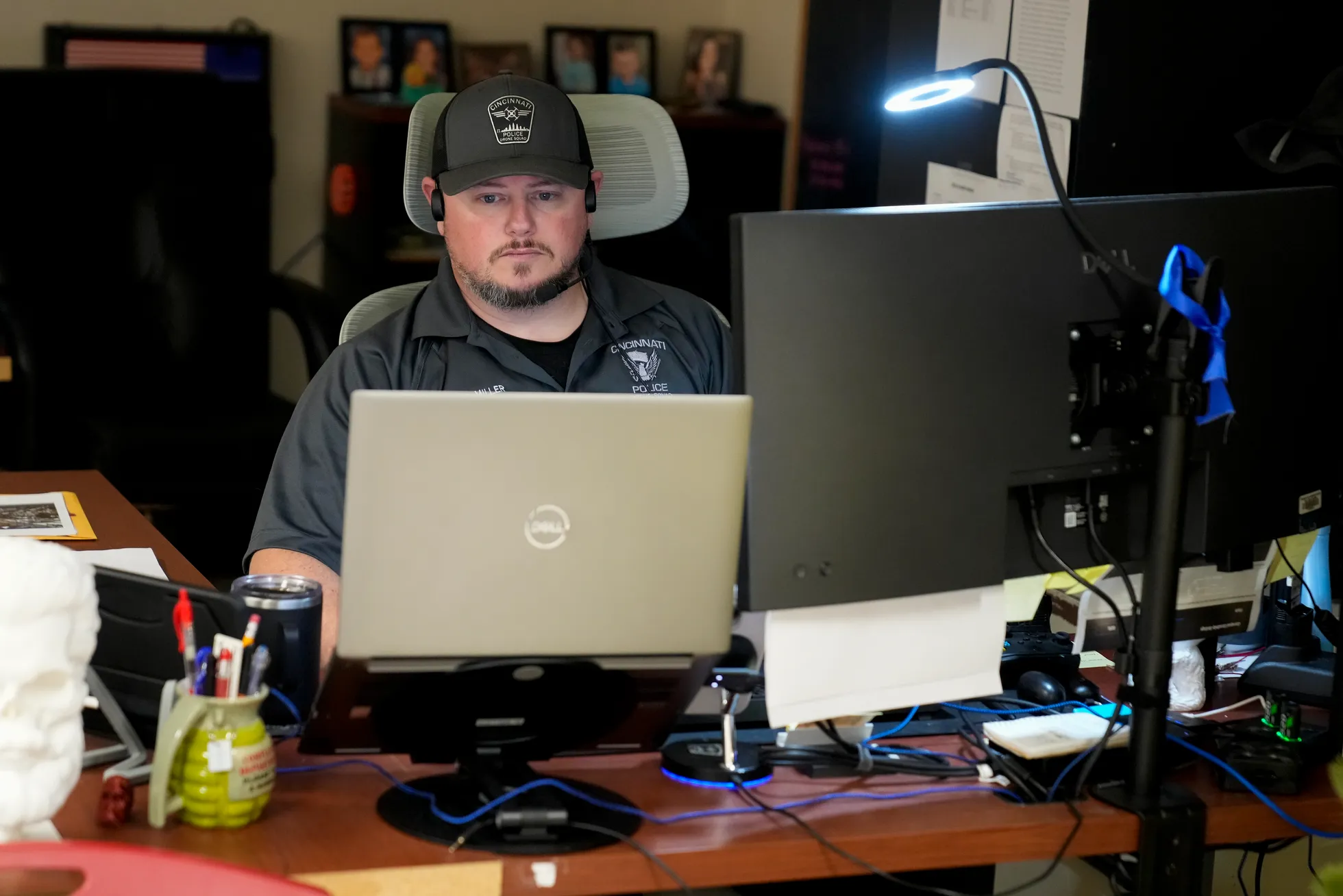 Officer Ben Miller commands a Skydio X10 drone from his desk at the Cincinnati Police Department District 1 headquarters in Cincinnati on Nov. 13. Sam Greene/The Enquirer