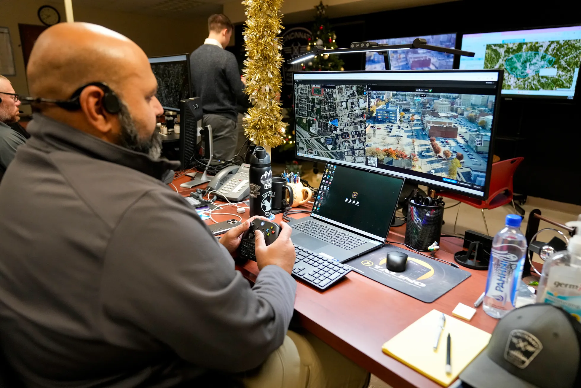 Police Specialist Matthew Martin uses an Xbox gaming controller to pilot a Skydio X10 drone from his desk inside the command center at the Cincinnati Police Department District 1 headquarters on Nov. 13. Sam Greene/The Enquirer