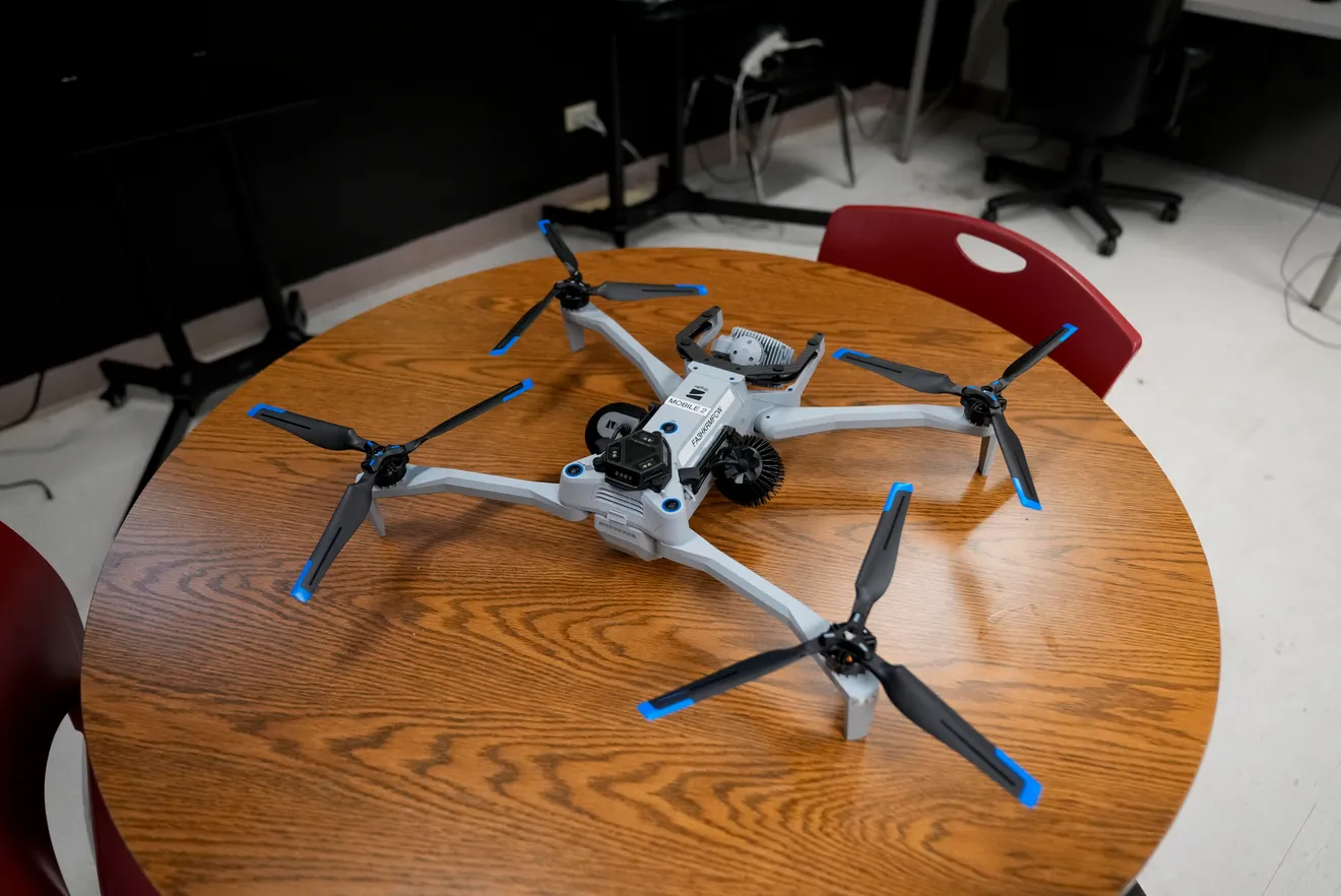 The drone, a Skydio X10, is built to perform under pressure. It can fly at up to 45 mph using AI technology to avoid obstacles in its path. A live feed with the drone’s camera broadcasts itself to Kemme’s screen.
